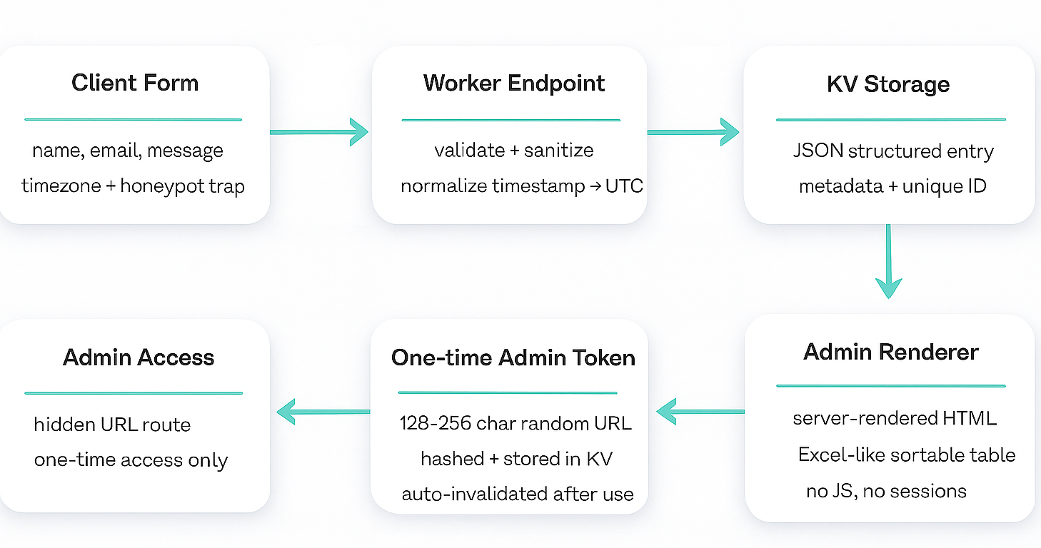 A custom Worker that validates, timestamps, normalizes, and stores each submission in KV, combined with a hidden admin dashboard for secure review.